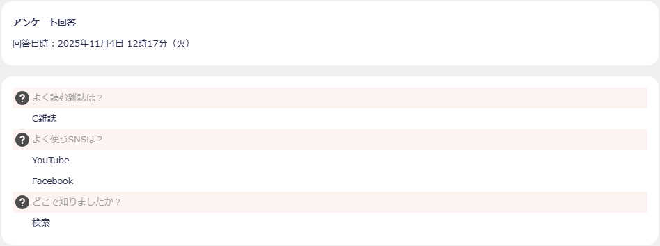 ![]() | アカウントのアンケート回答結果が表示されます。 |
