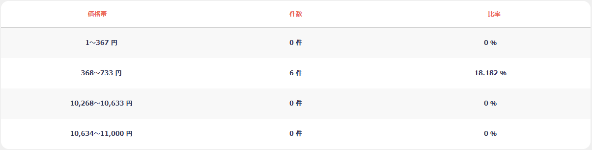 売れた商品の一番高い価格を基準に30分割して、販売した実績のある価格帯の一覧が表示されます。